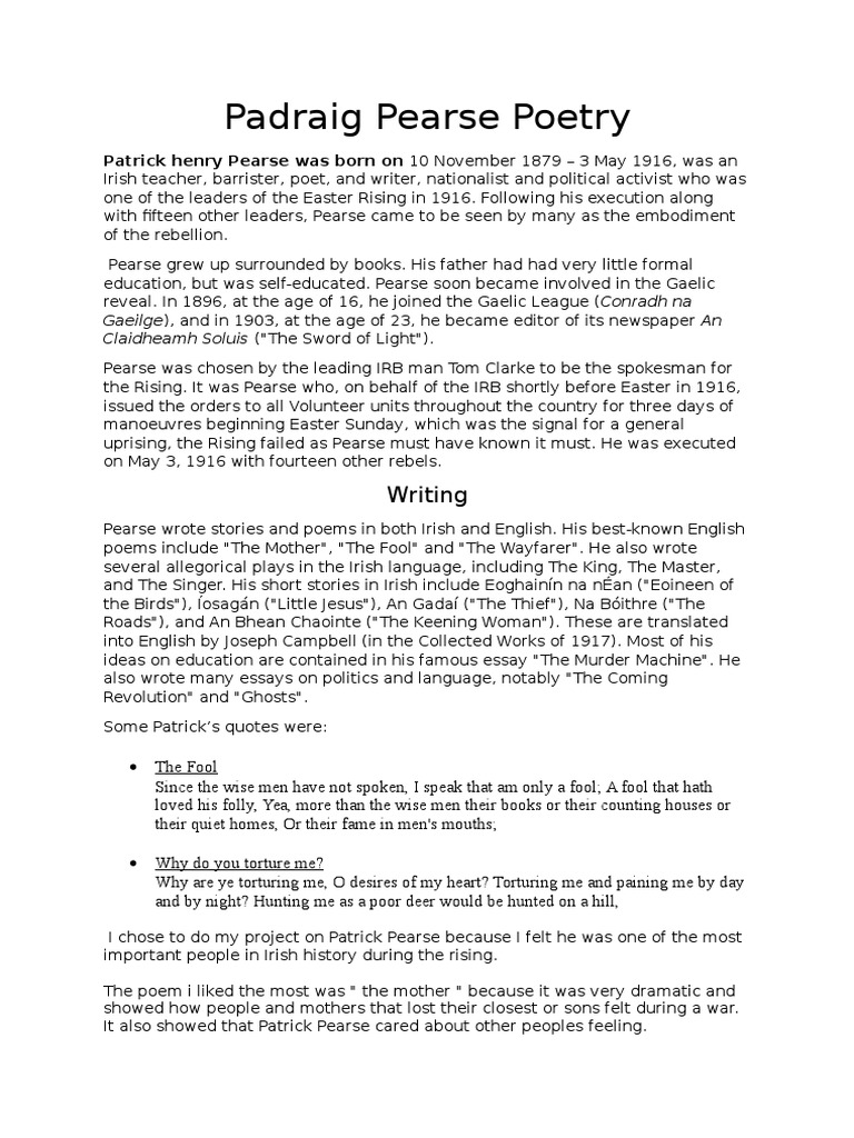 Padraic pearse poems the mother. Poem 1188 The Mother. I do not know how much you have heard since the last note I sent you from the GPO. Irelands 100 favourite poems.